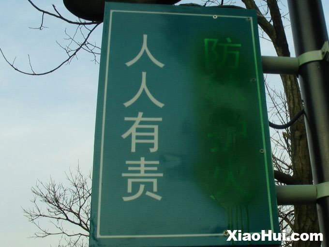 2006.12.17, 阳光暴好。住在深圳的两年多里, 几乎每个周末都去爬山: 大的梧桐山, 小的如笔架山, 莲花山, 南山, 每个星期都轮着去. 回湖南长沙几个月了, 都没空出去. 正好这天阳光不错, 难得的一个冬日暖阳, 于是便去爬岳麓山了. 在下山的路上发现了一张搞笑的标语, 一路上每个路灯上都贴着: 防林护火, 人人有责——实际应该是防火护林, 人人有责. 看来管理部门已经发现了, 将所有的防林护火都刷了层漆遮掩了过去. 笑晕. https://www.xiaohui.com/trip/20061218.htm